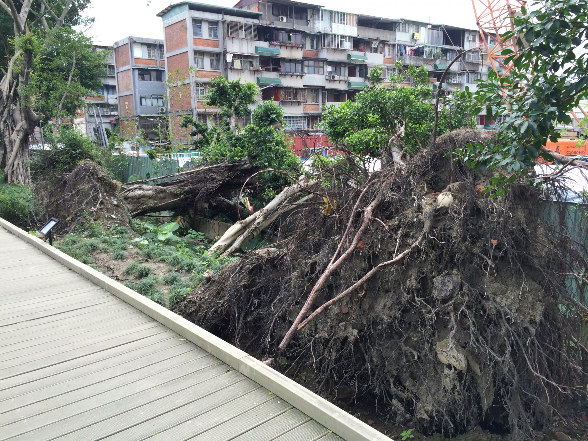 植物生態豐富的公園,有超過四分之一面積由樹冠覆蓋。倒樹原本旁邊的大樓是4層樓的民宅,在拆除重建時,遇到2015年蘇迪勒強颱過境,園區受損樹木達128株,兩株大榕樹也因此傾倒。