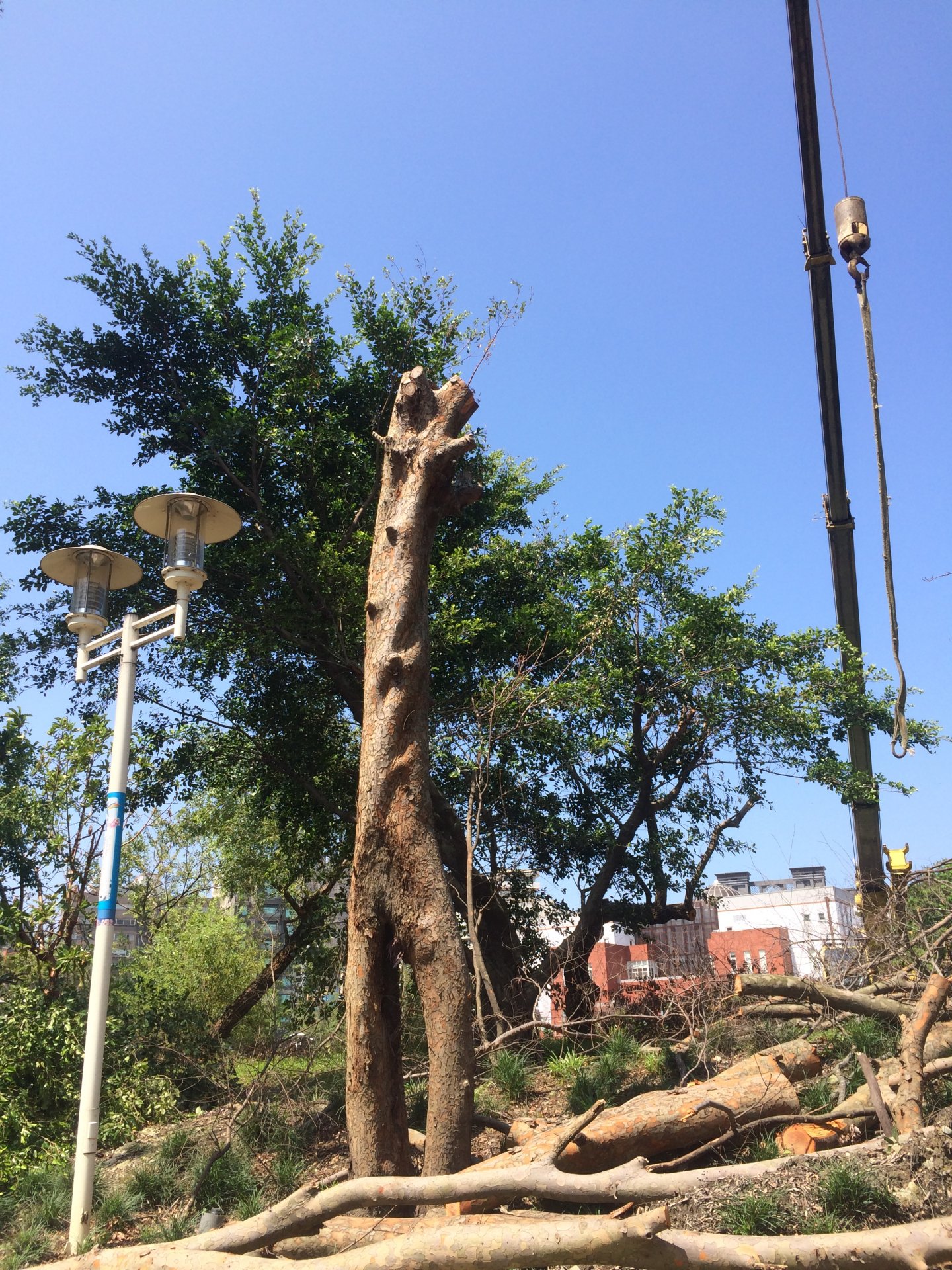 樹木倒下時,經過專業評估,當時的環境條件、工作動線只能選擇移除或維持現狀,在以樹為本的考量下,農場採取維持現狀,並考量日後大樓完工,倒木之間可形塑為拱門意象的出入口,孩童能與樹相伴成長,也成為與社區的互動媒介。