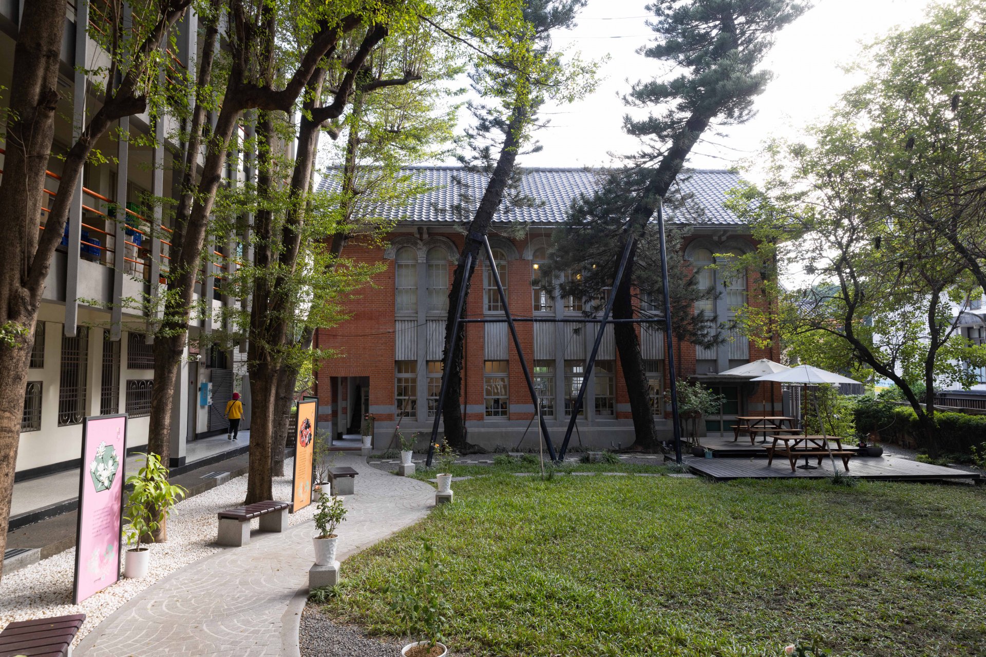 This building is a historic site built during the Showa period of Japanese rule. The former Forestry Affairs Office was dedicated to cultivating and managing the forestry industry. A surrounding wall approximately two meters high lies on the west side of the building. The Old Tainan Prefecture Hall lies to the east, while the library is to the north. Together, they shape the central courtyard, which is adorned with lush green grass and several tall trees. Among the trees , two towering hoop pines, planted around 1951, have withstood years of wind and rain and earned the nickname ‘ The Husband-and-Wife Trees.’ The building's overall architecture consists of a washed stone foundation, red brick walls, and a roof.