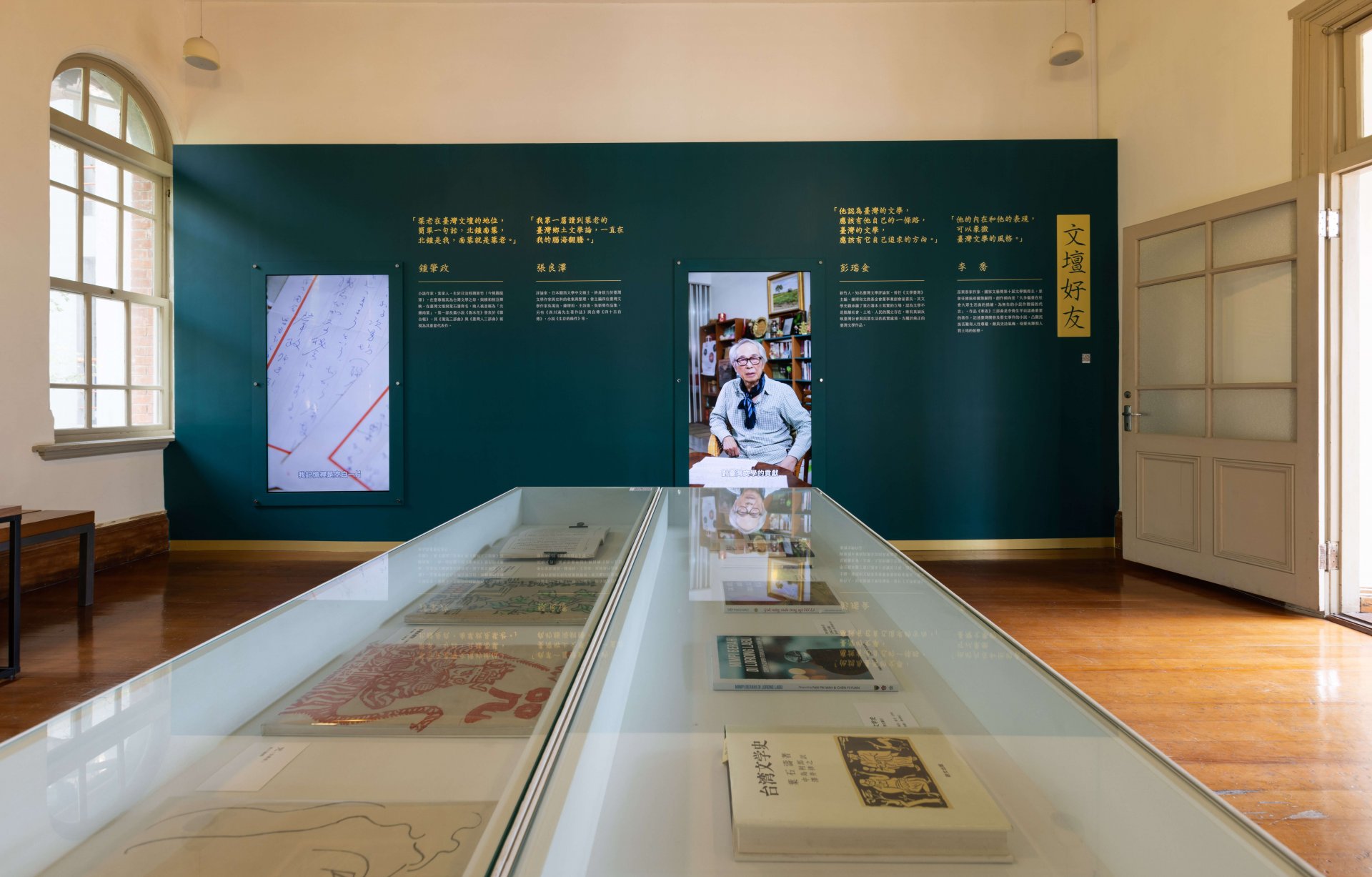 スクリーンの横には、2012年に葉石涛文学記念館の開館を記念して画家の故陳国進が描いた未完成の油絵が展示されており、これは陳国進の生前最後の作品でもあります。 絵の中の葉氏は眼鏡をかけ、親切でフレンドリーに見え、まるで両手を広げて旧友を歓迎する為に、去らずにいるかのようです。彫刻、絵画、書道においても、文壇における葉氏の重要性だけでなく、世界中の人々が彼を懐かしむ心や敬意を示していることを表しています。
