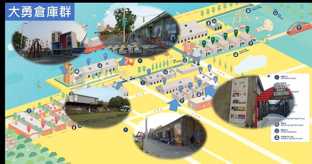 共有12棟倉庫,其中C5、P2為駁二最草創時期的兩個展覽場域,這兩棟倉庫目前都仍以靜態展覽為主要用途。C5倉庫臨大勇一側規劃為觀眾服務空間,並有一小型展場及以流行樂團演出為特色的月光劇場。陸續加入營運陣容的C1、C2、C4及自行車倉庫,目前主要籌辦實驗性、文創類或當代藝術型態之展覽。