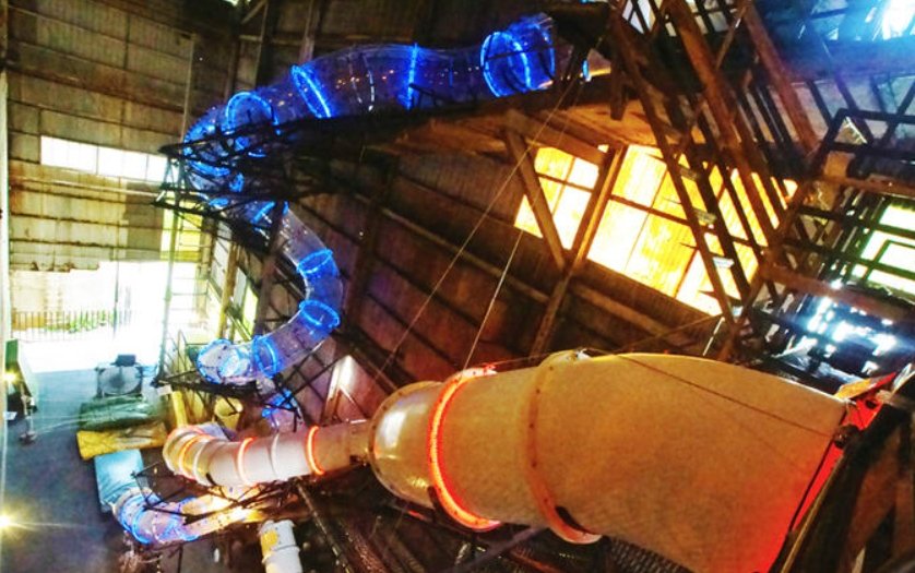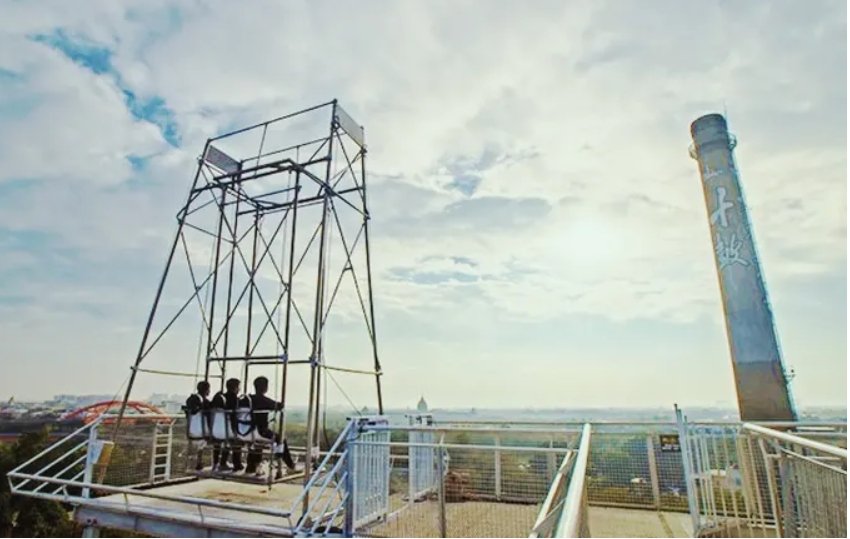 十鼓仁糖文創園區的煙囪溜滑梯,是全亞洲最高的室內透明溜滑梯,要搭乘前要先走上13.5公尺高的高台,要滑下來之前還要先坐上滑墊,以減少摩擦力,增加下滑的速度與快感,從上頭滑下來只要6~8秒,透明的滑道讓你更能感受到從五層樓高滑落的刺激感。