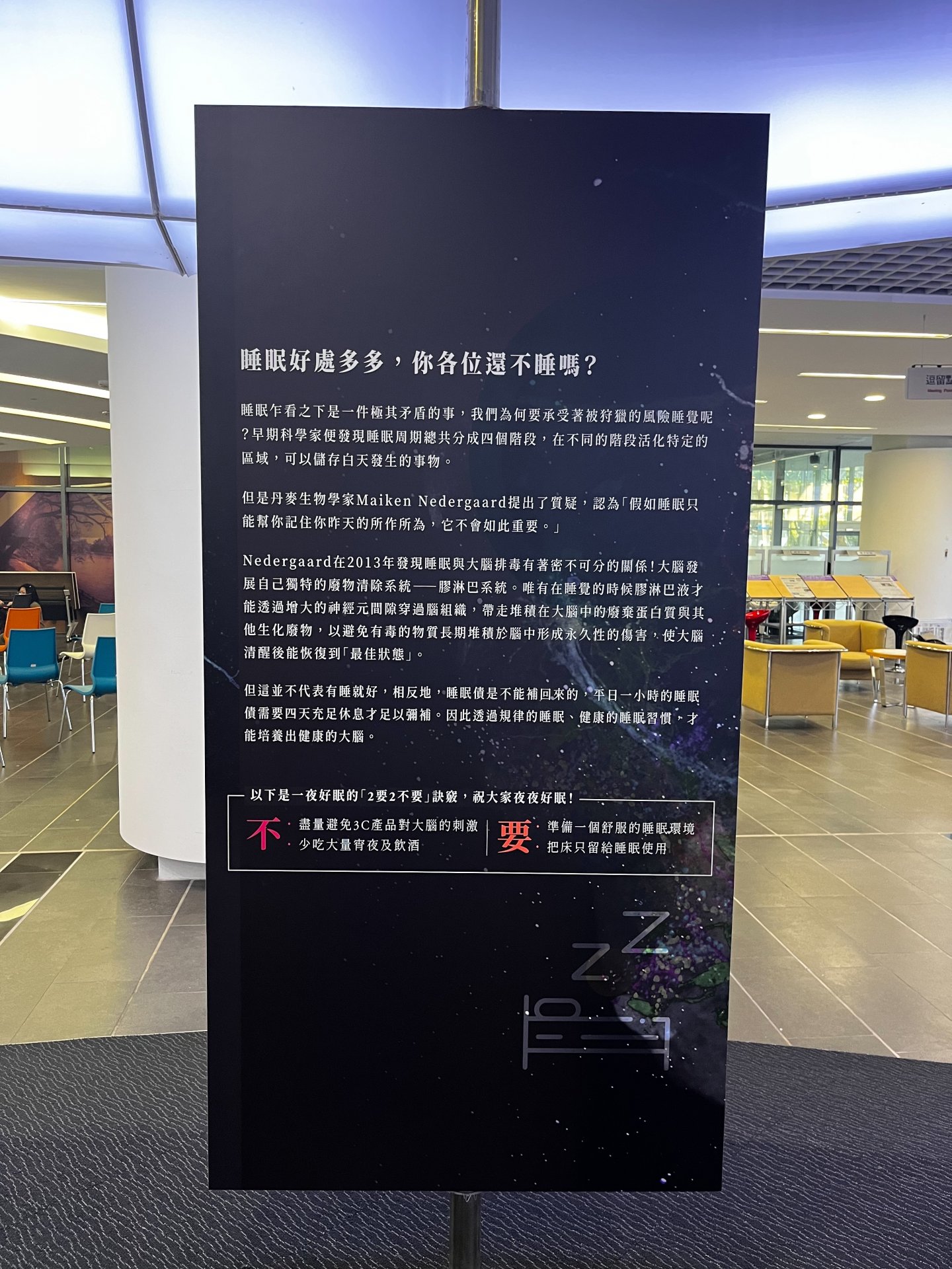 因此,尼德佳德在2013年發現睡眠與大腦排毒有著密不可分的關係!我們了解大腦中的蛋白質廢物的積累將會導致神經退化疾病,例如:阿茲海默症、帕金森氏症等。人體有淋巴系統為我們身體處理廢物,但是對於大腦,淋巴系統卻鞭長莫及,因此大腦發展自己獨特的廢物清除系統──膠淋巴系統。而唯有在睡覺的時候膠淋巴液才能透過增大的神經元間隙,輕易地穿過腦組織,帶走堆積在大腦中的廢氣蛋白質與其他生化廢物,以避免有毒的物質長期堆積於腦中形成永久性的傷害。