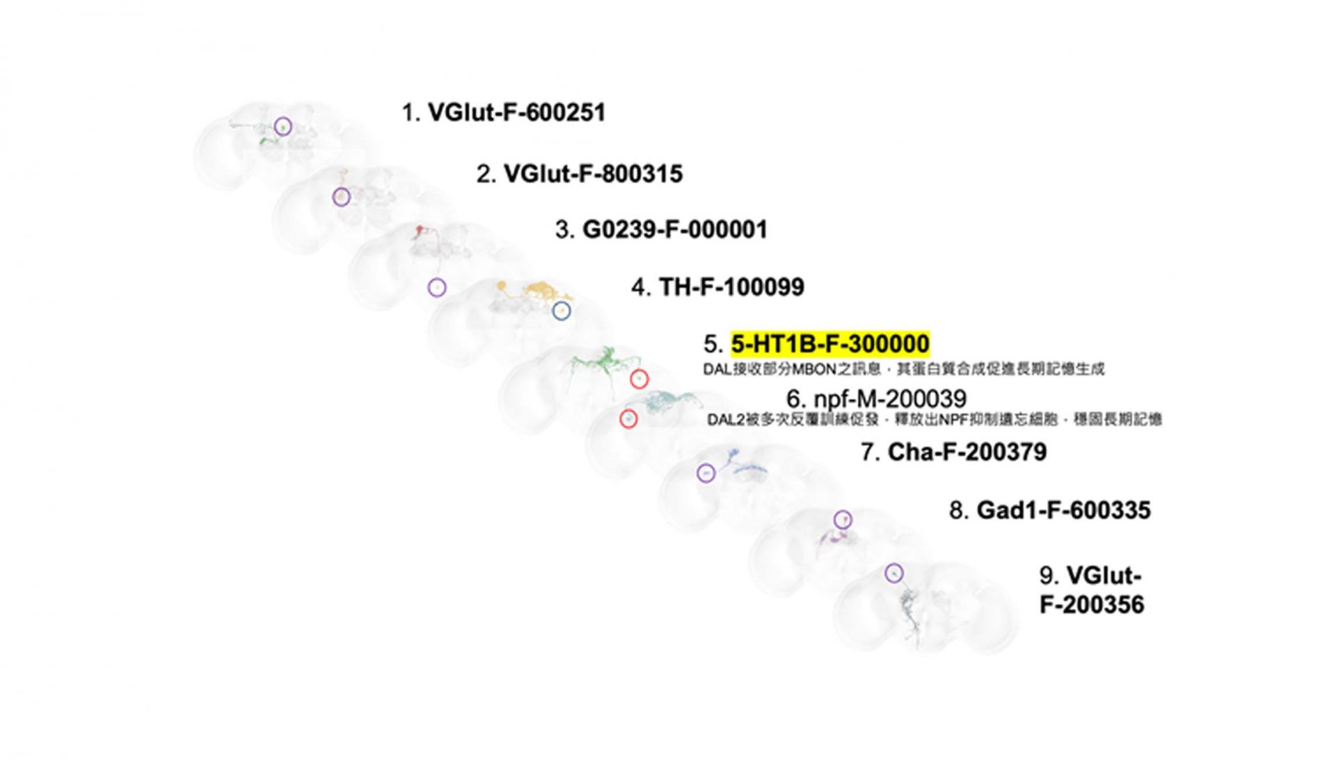 1.使用領先全球發明觀測單分子於大組織分布的超解析顯微鏡下的果蠅腦神經
