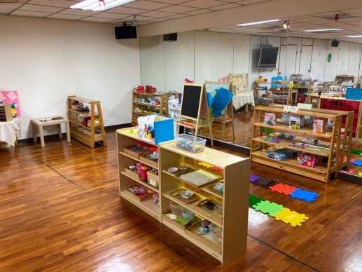 教室內有櫥櫃、桌、椅及各類學習區教具等,學生可以在此學習班級要如何布置學習區及各學習區適合放置什麼教具。