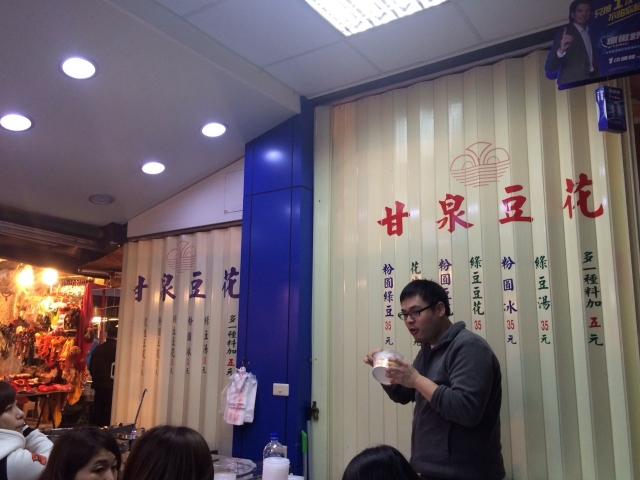 甘泉豆花為傳統豆花,其用料簡單,豆花的黃豆香味清香,重點是價格便宜,適合在吃完夜市的鹹食後來點不同的味道。