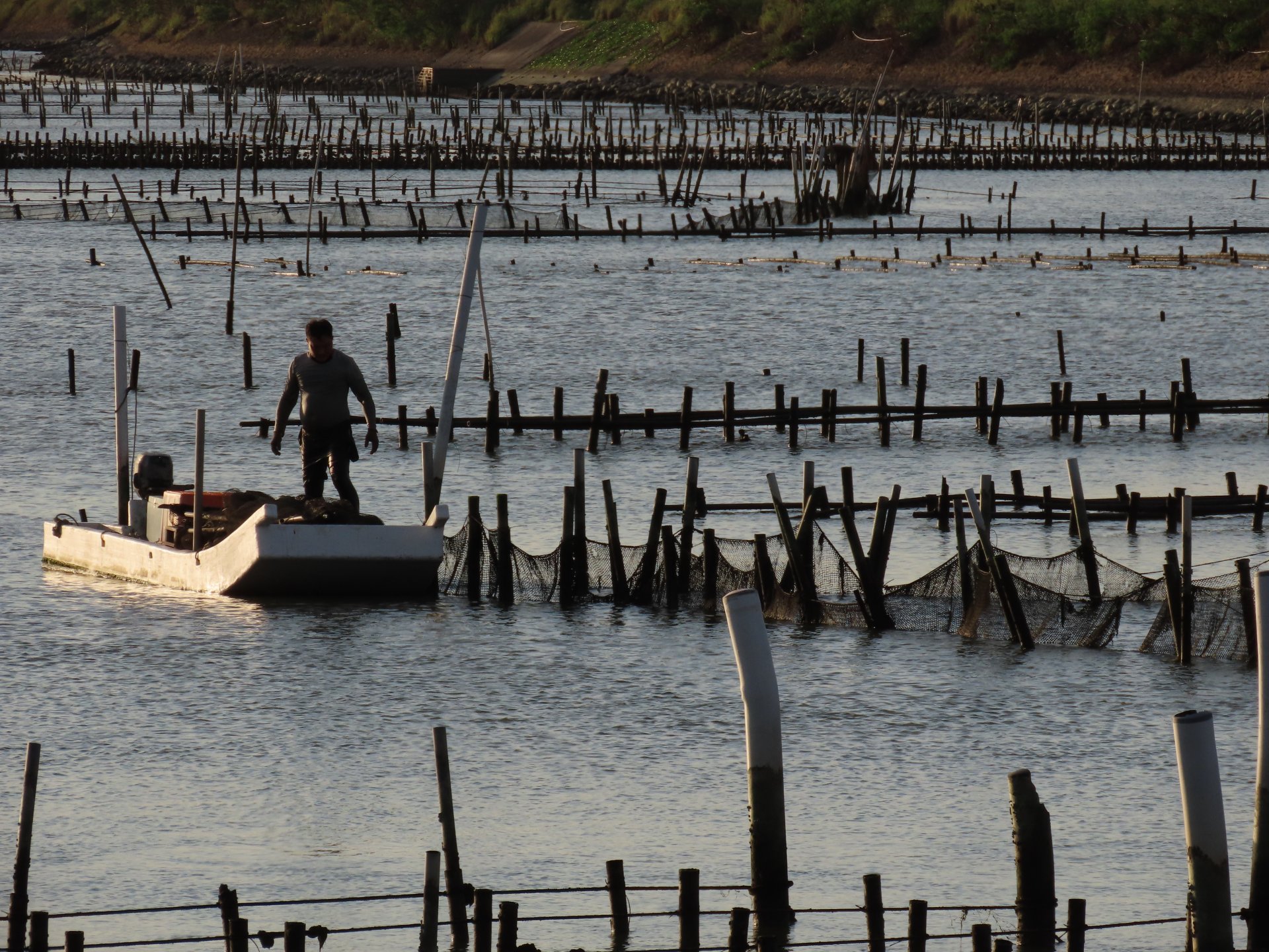 潟湖上滿佈蚵棚與竹竿圈起的漁場,漁民操作觀光漁筏巡遊其間,就如同開車般自如。一排排的竹竿圍籬長得都一樣,但漁民可是很清楚這是誰家的漁場。有時漁民會當場示範定置網如何操作。