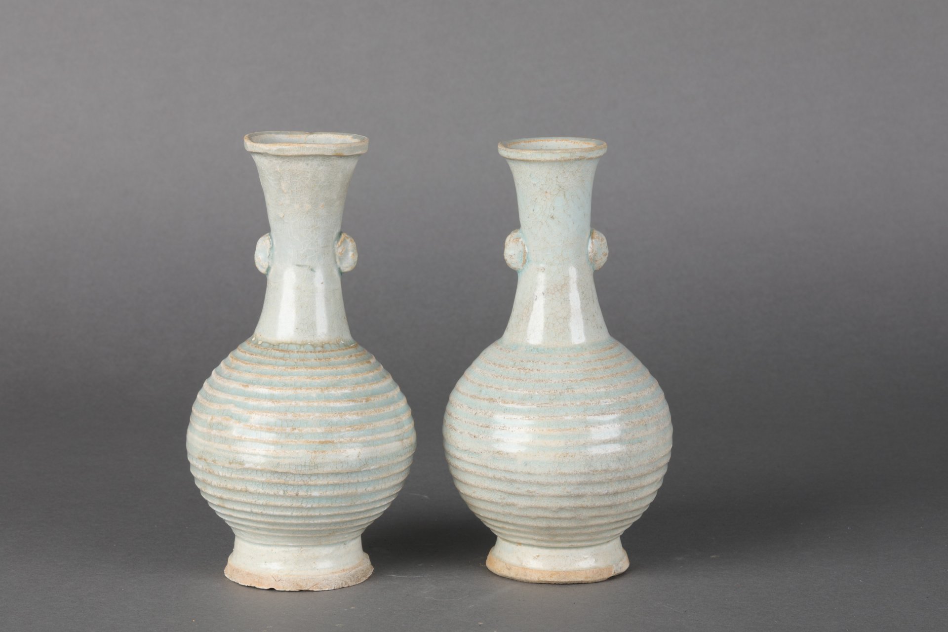 影青瓷特色胎骨潔白,釉色瑩潤,青白釉色更顯得有層次,瓶身頸部裝飾兩耳,外壁通體弦紋裝飾,簡潔雅緻,規整而又有律動。弦紋凸起處釉薄顯白胎,內凹處則積釉顯青綠,白、綠相間,淺淡相宜,外壁滿釉,釉質清亮,釉層勻薄,積釉處閃綠,釉層氣泡豐富,釉面見細小開片。內膛底部澀胎,胎質細白,成對為更加難得的佳品。