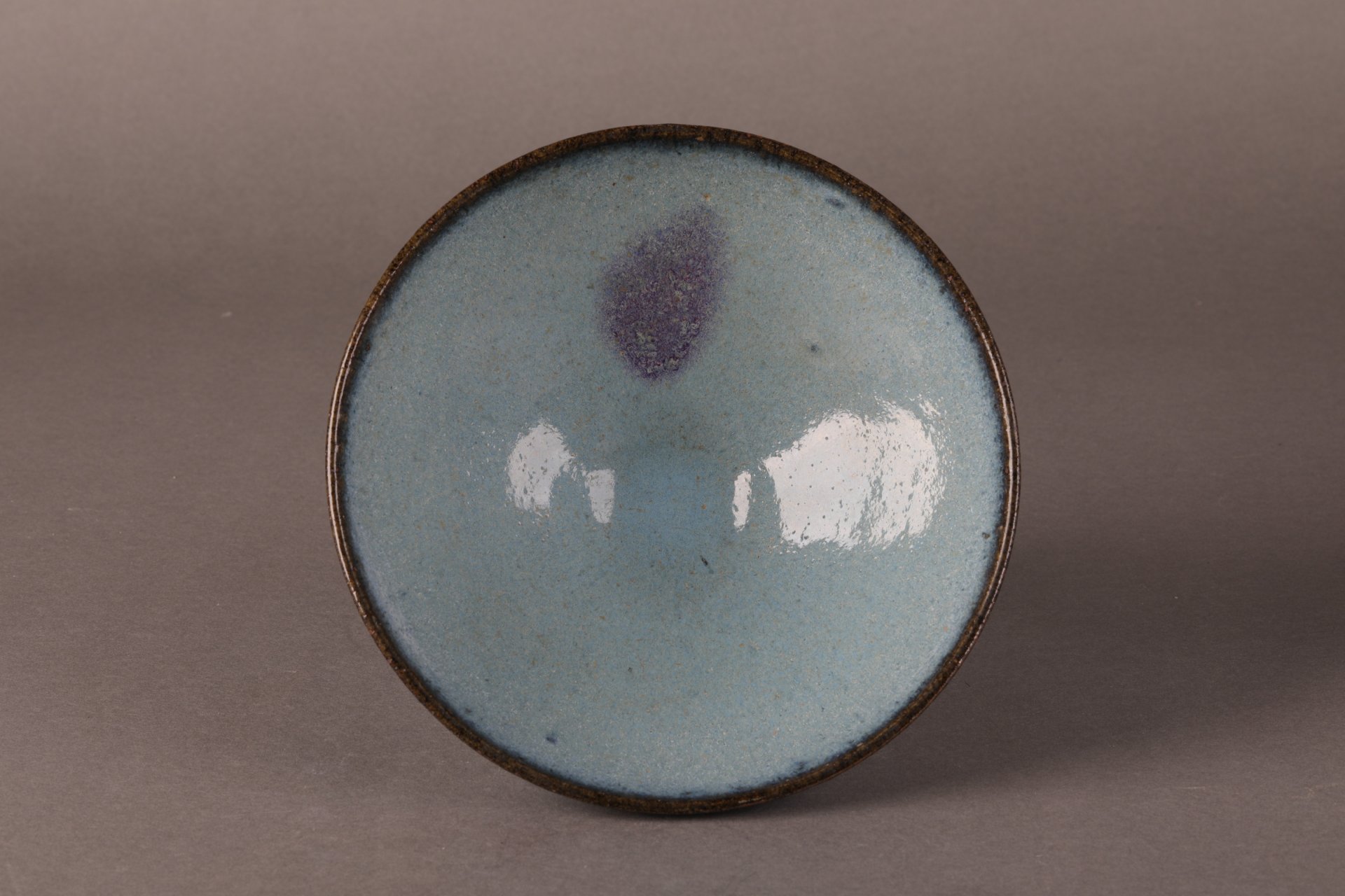 元代鈞窯紫斑碗,鈞窯釉色豐富多樣,釉彩有兔絲紋,紅的像胭脂,青綠像天空雲彩,紫色如茄,釉色變幻多樣,正是鈞窯的特色。本件作品碗中有一紫色斑紋,與天青窯變釉相映成美麗的畫面。