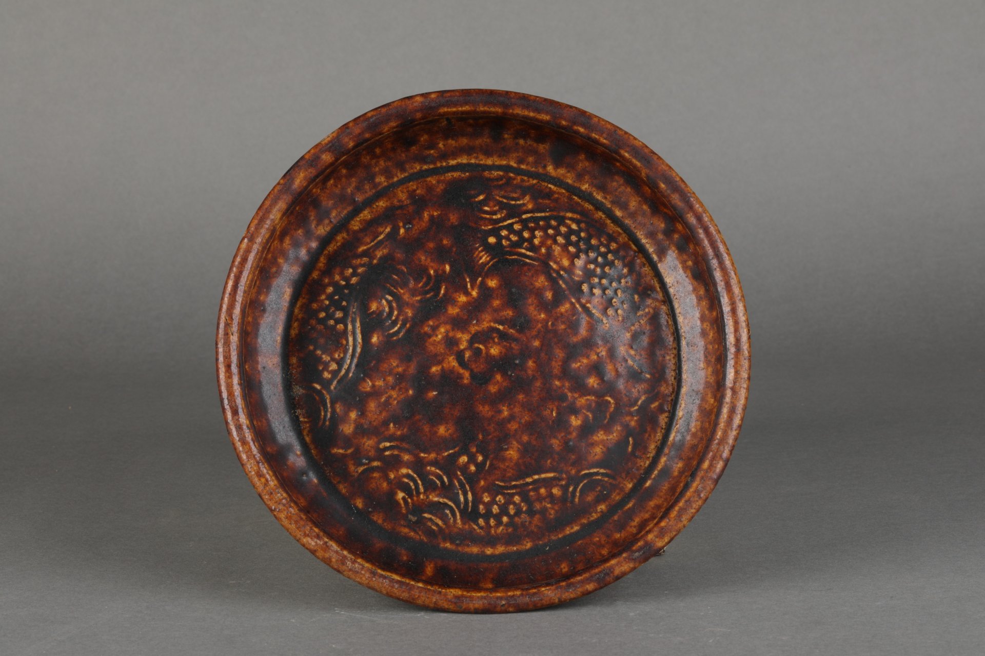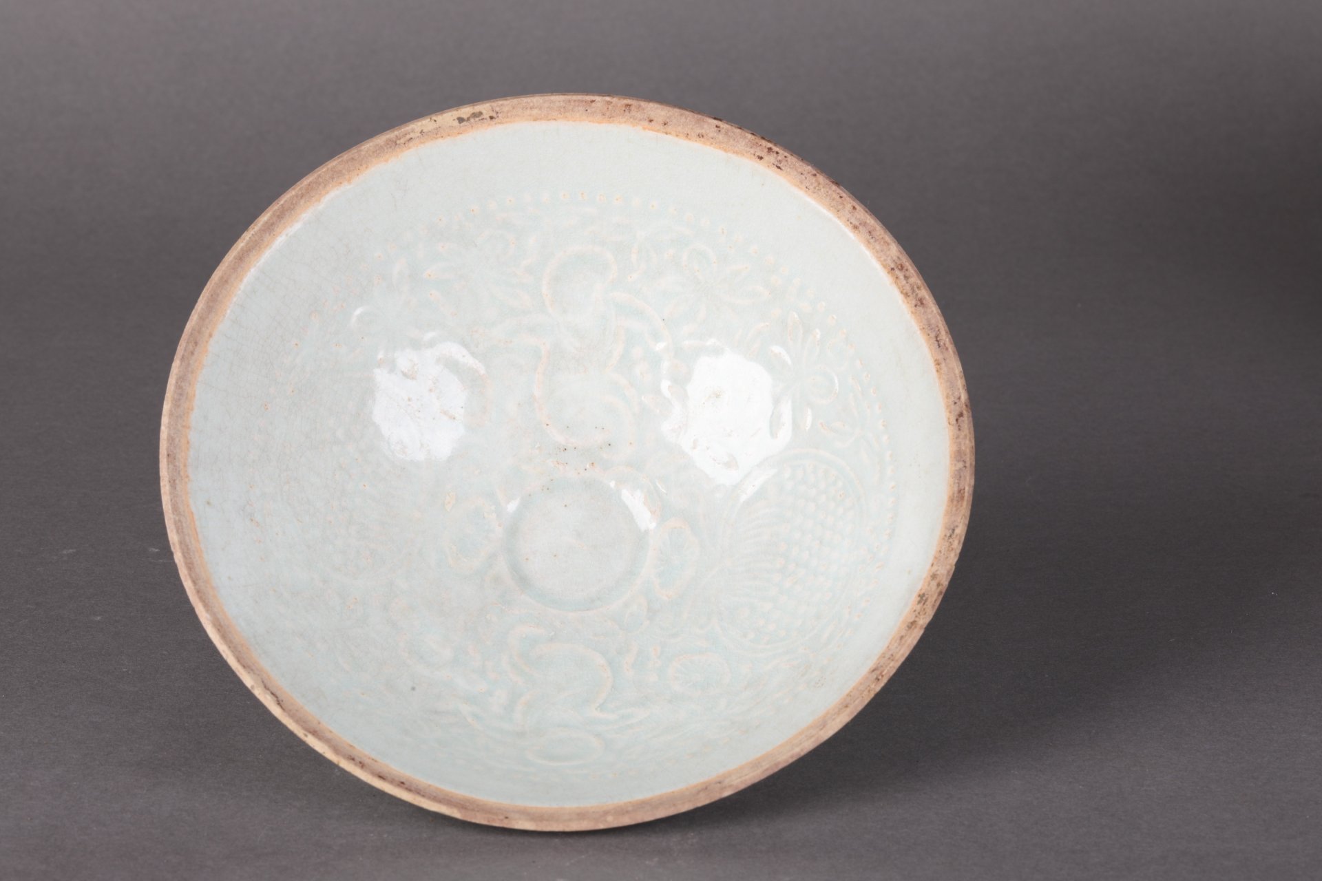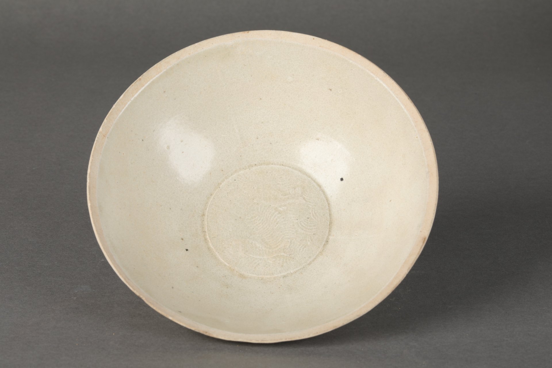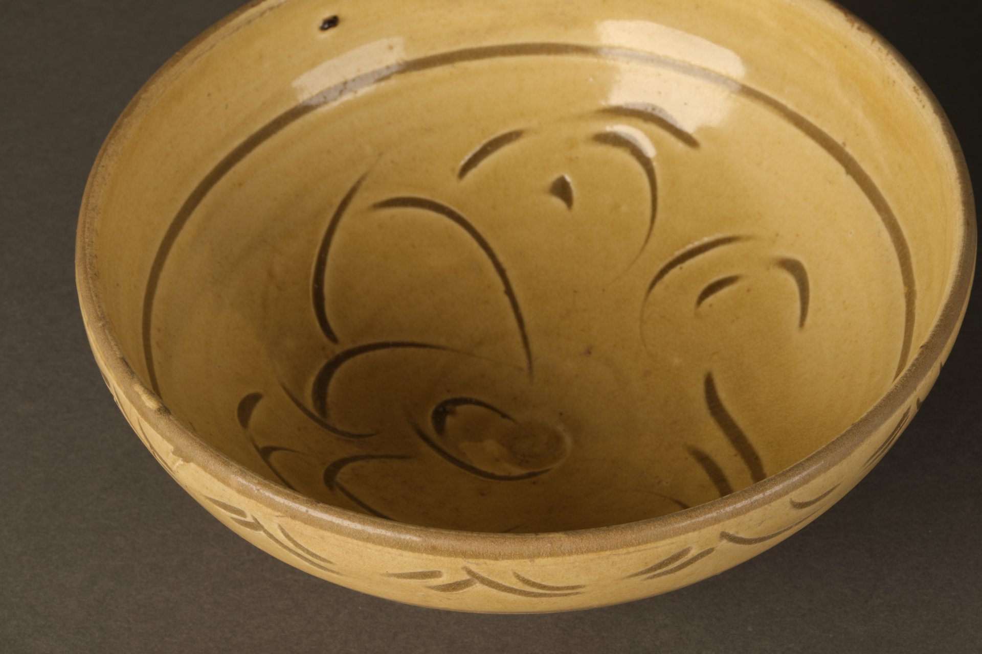 此件耀州窯碗,中國上海博物館、陝西耀州窯博物館也有收藏,敞口,圓唇,弧腹,圈足。碗內施滿釉,碗外施釉不及底。釉色青黃,有細小開片。盤內外刻簡筆牡丹紋。胎呈淺灰白色,此碗造型簡練,寥寥數筆就將花卉之紋路描繪得如此生動,碗內外用白色化妝土,再上薑黃釉色燒造成型。­耀州窯是宋代六大窯系之一,窯址位於今陝西省銅川市的黃堡鎮,唐宋時屬耀州治,所以稱為耀州窯。