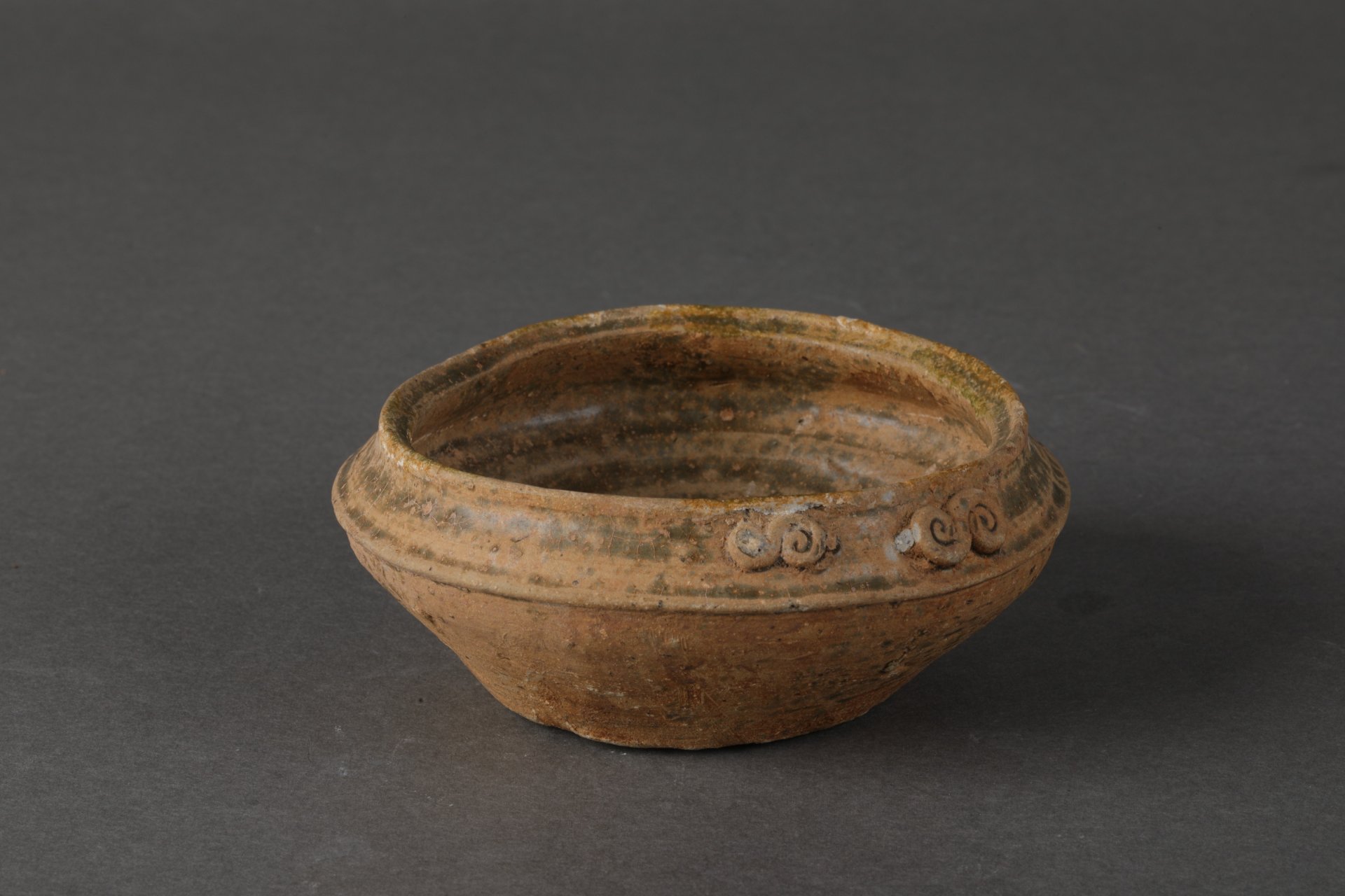 西周。原始瓷器。敞口,淺腹,圈足外撇,整器飾有弦紋,貼塑“s”形紋飾。施青釉,造型古樸。西周中晚期,原始瓷開始大量使用S形堆紋裝飾,貼飾於尊、簋、碗的翻折沿以及盂、缽等肩部位置。
