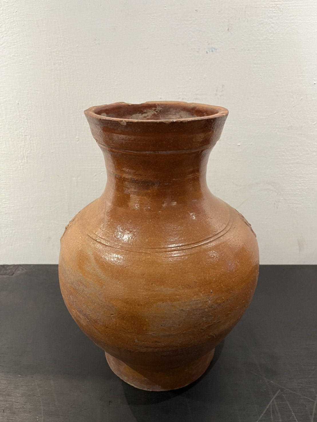 此陶壺仿銅壺造型燒造,釉層清澈透明,釉面光亮可鑑,花紋具有漢代獨特的裝飾風格,體現出漢代釉陶藝術所取得的成就。