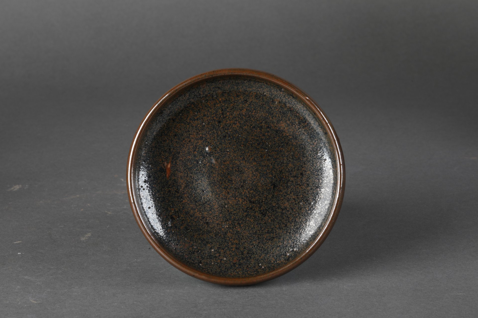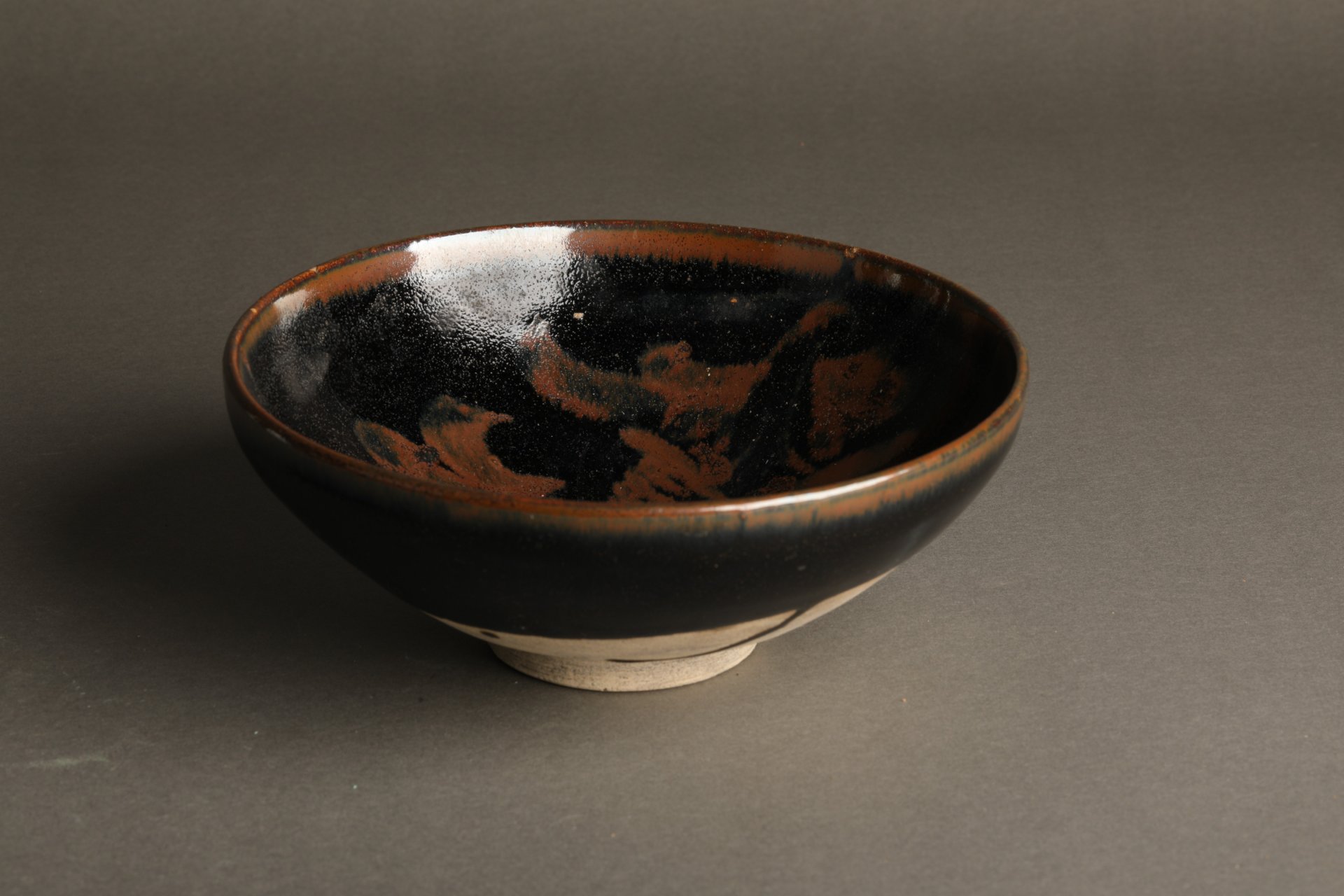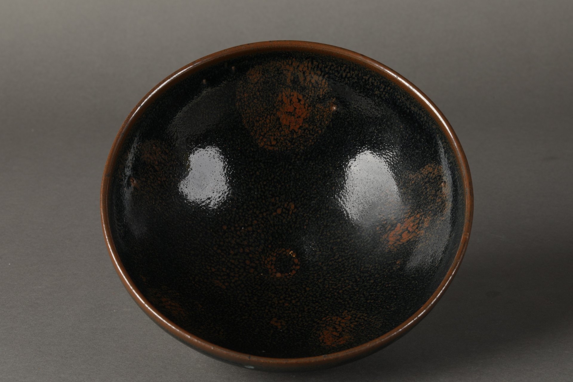 此件黑釉油滴碗,束口,淺腹,小圈足。燒造於宋代時期的磁州窯,磁州窯油滴釉在宋金元北方窯瓷器中是極其名貴的品種。斑紋大小不勻,但邊緣整齊,布局較密,灰黑胎,胎質堅緻,胎體厚重。施黑釉至下腹部,口沿釉較薄,腹下部釉較厚,積釉呈滴珠狀。內外可見明顯均勻的油滴斑,油滴細密清晰。應是宋代王公貴族日常使用器皿。