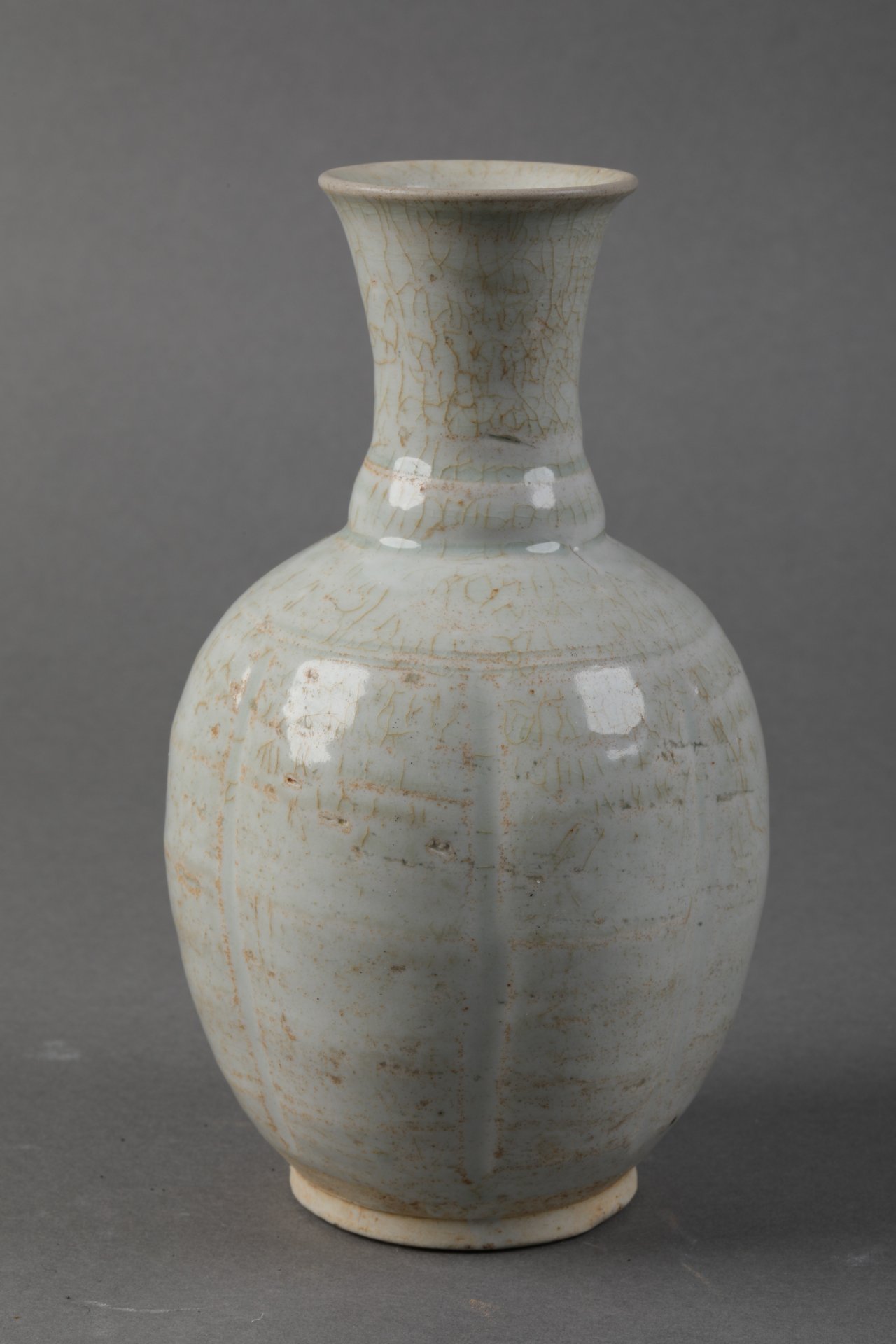 宋代影青瓜棱瓶手工拉坯成型,撇口,長頸,溜肩,腹部以下漸收,腹部凸凹的孤線組成似瓜棱式的形體。整體造型端莊秀麗。瓶腹部凸凹的孤線組成似瓜棱式的形體,胎質細膩、造型插秀、體薄透光,釉色如水似玉,色澤水麗,宛如溫潤的白玉,古樸素雅,給人玲瓏剔透之感。