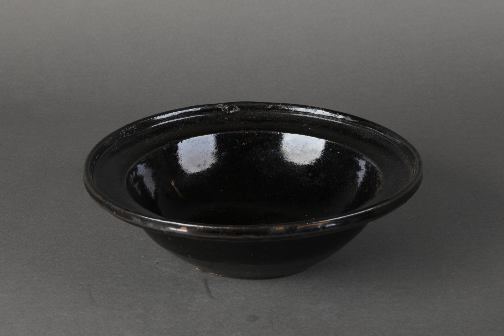 此物為洗,宋代黑釉折腰洗,造型規矩,釉面溫潤如玉,釉水肥厚,撇口弧壁,折腰,矮圈足,通透施黑釉,烏黑發亮,整體線條簡潔,器形典雅而不失秀美,胎質細膩,精緻又不失古韻,整體頗富美感,是北方磁州黑釉的佳作。