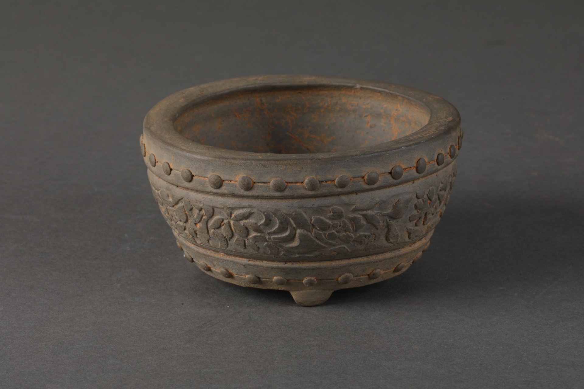 此爐斂口,深腹,平底,下承三足。口沿及近底處環鼓釘一周,中部刻劃花紋,刀法簡逸流暢。器型簡潔流暢,質地細膩,素胎燒造而成,古樸精美。