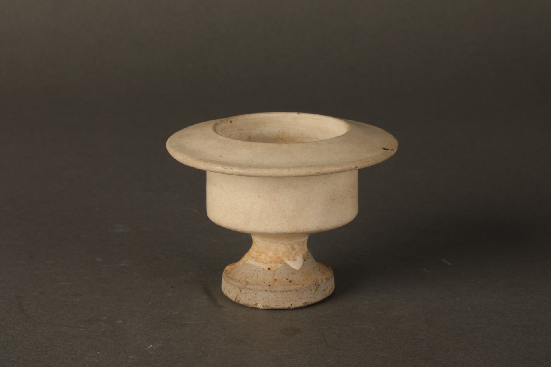 此行爐胎質灰白,器身施化妝土,再上白釉,釉不及底,高溫燒製。佛畫上常可見菩薩手握焚香行爐,古代盛行焚香行爐乃香道具的代表作。