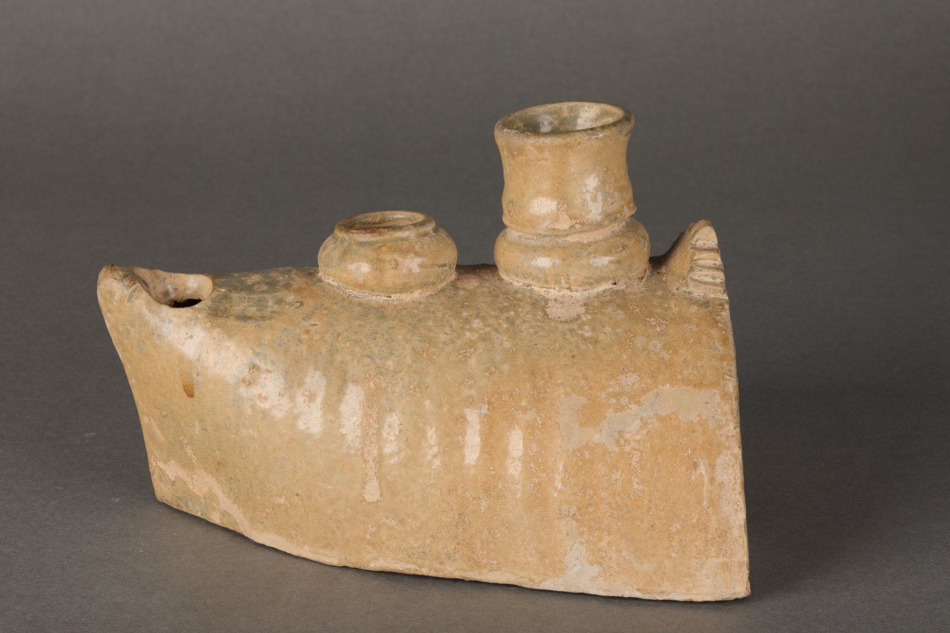 漢代綠釉陶,以鉛的氧化物為呈色劑,用還原焰燒製成翠綠色,出土時鉛釉氧化泛出銀光,造型樸實,自然天成。此器物造型擬真,可以看得出當時漢代人們生活之樣貌,實屬難得。