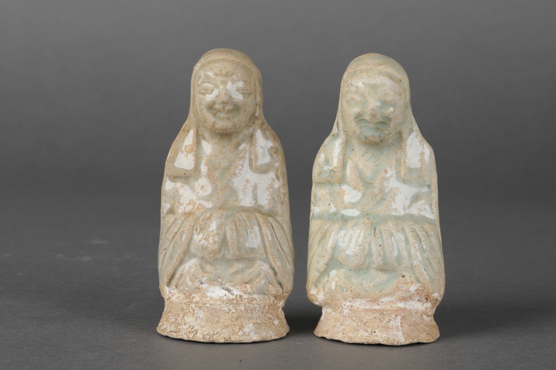 影青是人們對宋代景德鎮燒製具有獨特風格的瓷器之名稱,釉色青中帶白,白中閃青,胎骨薄而白,它的特點是瓷質極薄、釉細白而青,暗雕花紋,內外都可以映見,故有人叫它為影青、隱青或者叫它罩青。這對人俑小巧精緻,頭披頭巾,衣著整潔,呈跪坐姿,釉色瑩潤精細,晶亮透徹,面露微笑,神態温順恭敬。