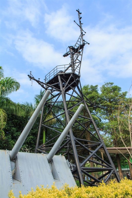 早年海軍驅逐艦上都裝有五吋砲,眼前的MK-32雙聯五吋三十八倍徑兩用砲,是美國海軍於二次大戰期間研製的高平兩用半自動武器。而在一旁的是軍艦的桅杆,是慶陽號除役之後拆下下來的,雖然都只是軍艦上小小的一部分,但卻記載著相當珍貴的故事。