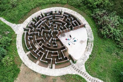 涼亭的屋頂像三角形,裡面像蜘蛛網