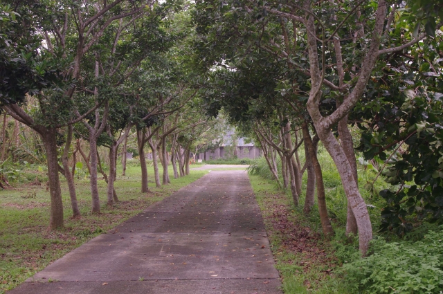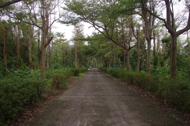 本園區為了抑制小葉欖仁的頂芽優勢,採人工方式修剪樹冠,不但可維持樹形的美觀,還能增加下層樹冠的面積,讓遊客在烈日酷暑仍能享受自然的涼意,不僅如此,園區還將剩餘的樹枝絞碎成木屑鋪設於步道,真是一舉多得的做法。