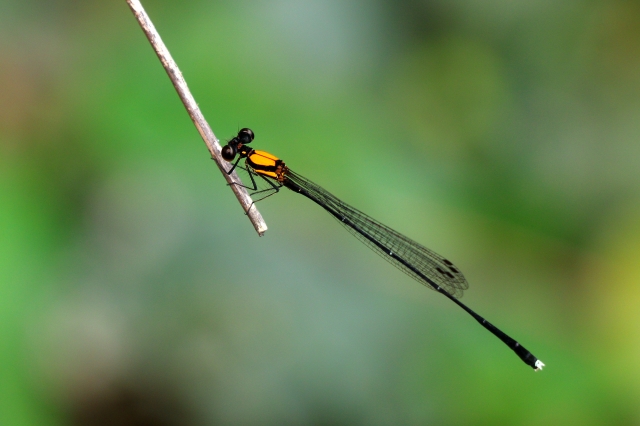 弓背細蟌是非常鮮豔的紅色豆娘,牠是屬於蜻蛉目細蟌科,全身鮮紅色的光澤,在陽光下就像是一顆紅寶石,那樣的閃閃動人,主要棲習在全島1200公尺下的溪流環境,出現的月份在3~12月,園區內各處的水域都可見到牠的踪影,數量相當多,是普遍易見的豆娘,在繁殖季時,雄蟲會以腹部末端的攫握器,就像牽著雌蟲而形成類似愛心的形狀。