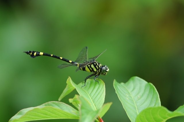 粗鉤蜻蜓。園區在春夏之際常有不少大型的蜻蜓在空中穿梭,時而在巡弋水域,時而停棲在水草頂端,其中最常見的就是粗勾春蜓,牠是屬於春蜓科,全身主要是黑黃相間,行動快速,也只有等牠停下來休息時,才能看清牠的模樣。牠常停棲在水生植物的頂端,天氣熱時會將尾部抬高,減少日曬的面積,從正面看起來真的像假面超人,而當牠在空中停滯飛行時,就像是直升機一樣在空中停留。