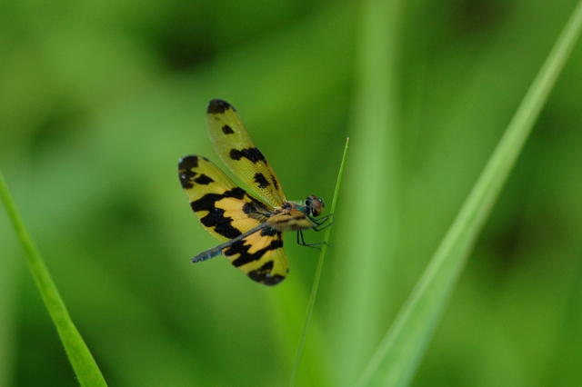 彩裳蜻蜓是相當漂亮的一種蜻蜓,牠屬蜻蜓科,從平地到低海拔山區都可以見到牠的踪影,常棲息於清淨的池塘或沼澤,常成群在空中飛舞,成蟲於4-10月出現,牠的翅膀黃色具黑色的斑紋,非常漂亮,就像蝴蝶的翅膀,而牠飛行緩慢,姿勢也像蝴蝶十分的優雅,故有「蝴蝶蜻蜓」之稱,算是較為少見的種類,在園區內的生態池附近偶而會見到牠們身影。