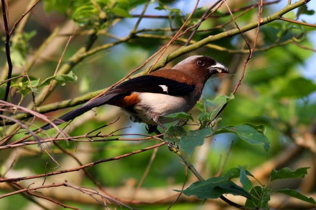 樹鵲是鴉科鳥類,跟台灣藍鵲及烏鴉都是近親,牠全身都是暗褐色至黑色,翅膀上有一個明顯的白斑,有著黑色長長的尾羽,而尾下為橙黃色,牠的叫聲宏亮、會發出嘎嘎的叫聲,喜歡成群活動覓食,但偶而也會單獨的出現,牠屬於樹棲型鳥類,主要在園區內的樹林中上層活動,雖然很機警但並不怕人,有時也會下到樹林底層來尋找各種食物。