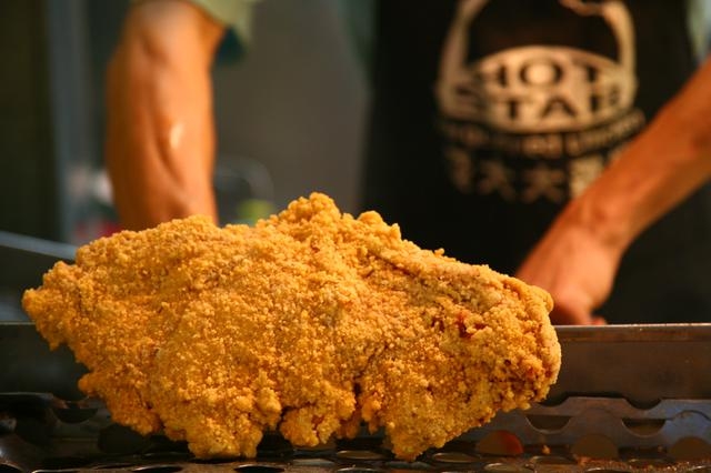 豪大大雞排選用超大塊的新鮮雞肉,現場裹上獨門的炸粉,待油溫達攝氏195度時立即下鍋快炸;熟成後的雞排,外皮酥脆且裡頭肉汁鮮美,是士林夜市的必嚐美味唷!!