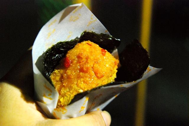 有別於坊間使用白米或糯米製作的飯糰,金本丸使用了健康的五穀雜糧米,一顆顆飯糰都是現點現炸,入鍋炸至金黃色後,再添入各式醬料、包裹上新鮮的海苔片,吃起來脆勁十足、香Q夠味,讓人忍不住想要一顆吃完再買一顆呢~