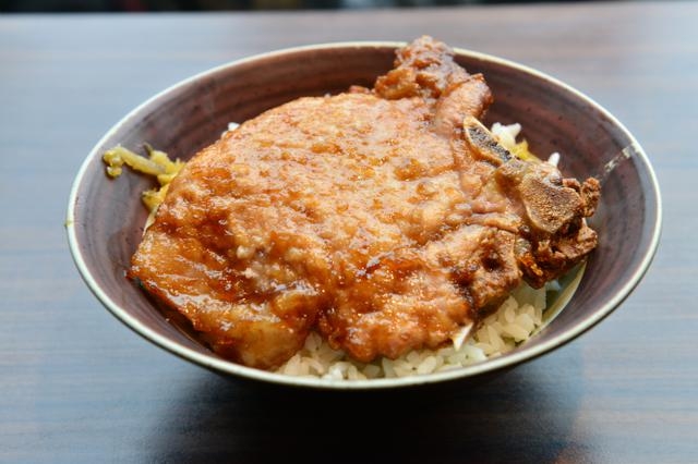 大碗的白米飯上,蓋上拍扁、炸得酥亮的大塊排骨肉,在佐以豆干炸醬和酸菜,最後再淋上氣味濃郁的獨家醬汁,如此的賣相,看起來就非常過癮,讓人彷彿回到大口吃肉、大口扒飯的學生時代。