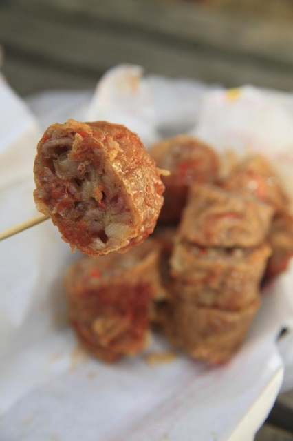 太特別了吧!店家門口左側招牌清楚寫著「肉羹沒有ㄍㄥ,雞捲沒雞肉」,即使如此,楊家沒有雞肉的雞捲仍大獲好評。老板將芋頭、洋蔥、馬鈴薯等食材剁碎後,混合包裹成條狀,下鍋油炸成金黃色,外皮酥脆而內餡鬆軟,口感超棒的喔!