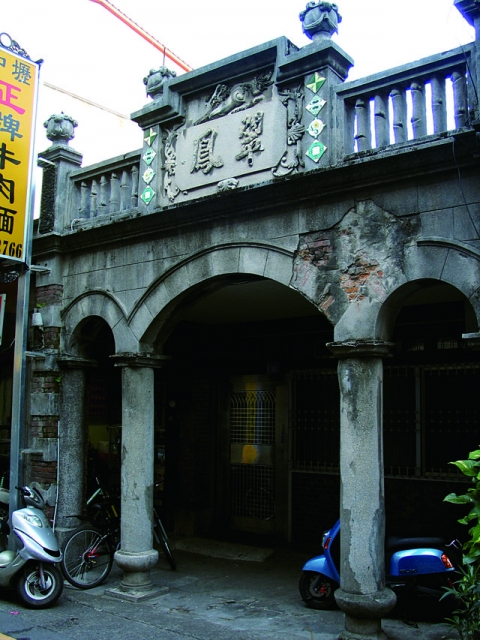 大溪中央路上,也有許多古色古香的牌樓,翠鳳除了匾額題字與赤龍不同外,其他的建築特色可謂左右對稱,整體作工精細優美。牌樓面上可見利用酒瓶玻璃片弧形表面黏貼的「翠鳳」二字,因年代久遠多已脫落,徒留泥塑字樣留給大家自己想像囉~~