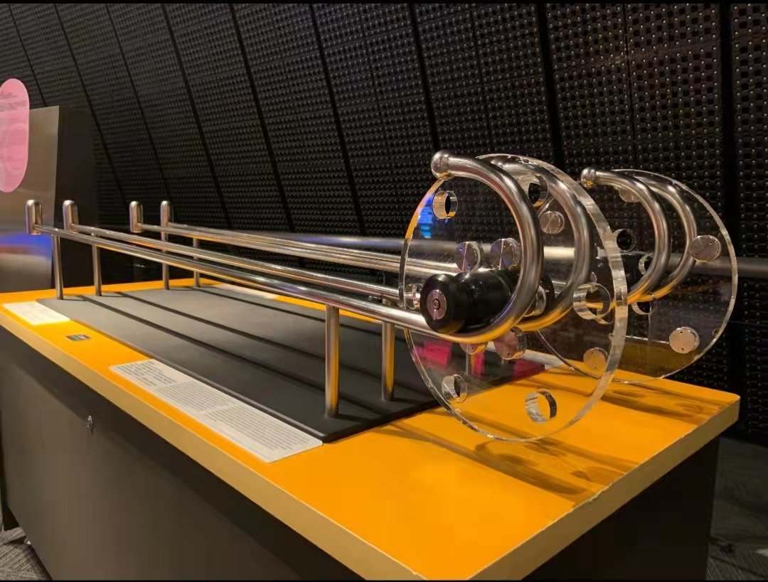 轉動慣量是一個物體對於旋轉運動的慣性大小(回轉物體保持其勻速圓周運動或靜止的特性)的量度,質量分佈對其有直接的影響。質量分布越遠離轉軸,轉動慣量越大,在同一作用力下,轉動慣量較大的物件之角加速度較小,即轉速之變化較慢。本展品質量集中在邊緣的車輪,獲得的動能較多消耗在轉動上,所以沿軌道行進的速度就較慢了。