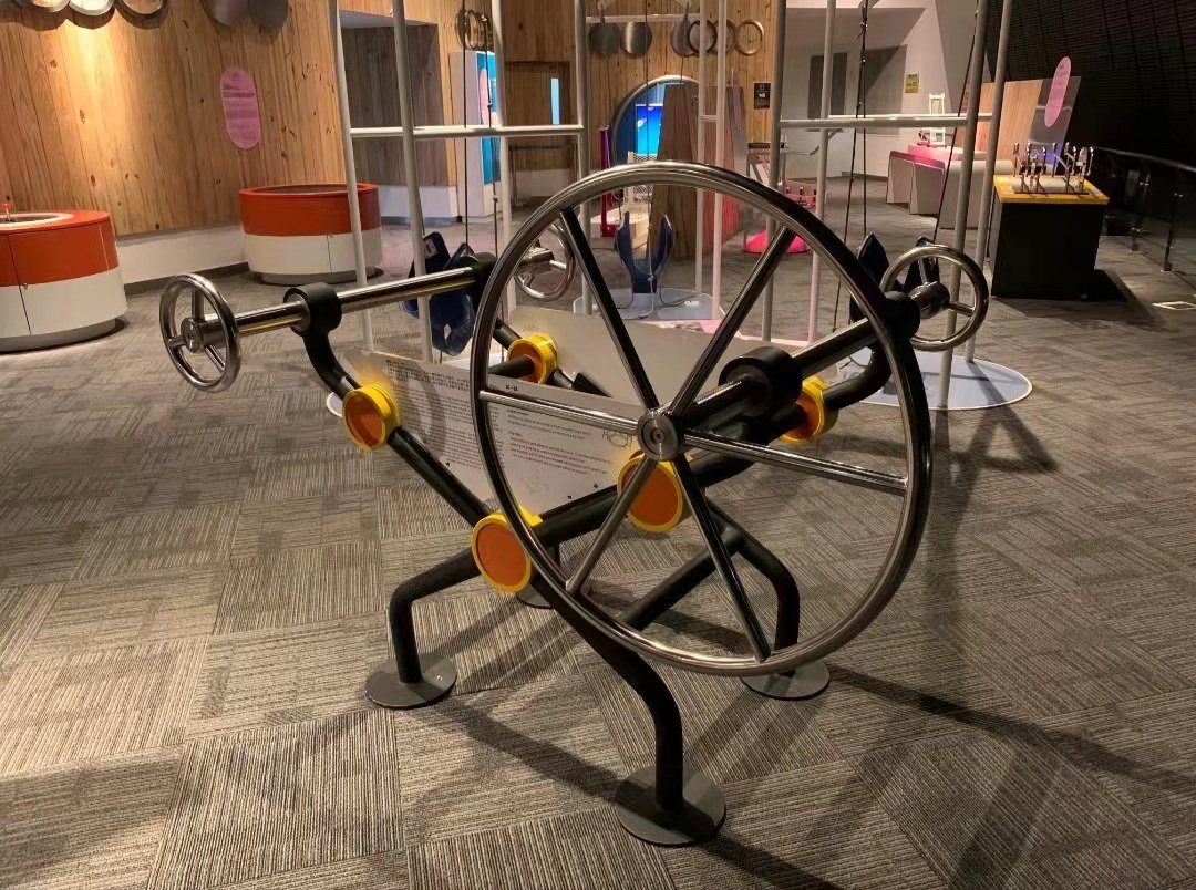 本展品由兩組同軸的輪子組成,其中一組的輪子大小相同,另一組的輪子有兩種尺寸。使用同樣的力轉動輪軸時,輪子直徑越大,可產生更大的扭力,相當於以軸心為支點,半徑為桿的槓桿系統,此原理也應用於螺絲刀等工具。所以若你手中的輪子直徑比另一邊的大,就可以用較小的力勝出比試了。
