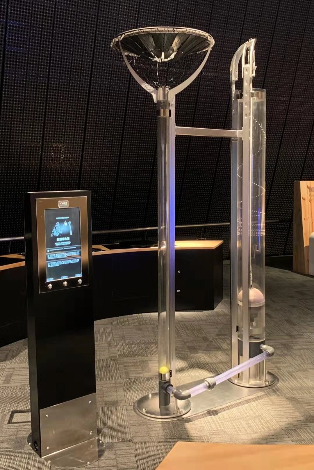 保齡球迫使較大管子內的空氣柱流向小管,從而使小管內的網球高速射向天花板。在固定的時間內,等量的氣體流經管子的每一截面,大管裡的保齡球就像一個活塞,迫使管內的空氣柱移動。當空氣柱被強迫進入另一段直徑較小的管子時,其速度會增加,這是因為質量守恆定律,質量在同一個封閉系統內保持不變。其結果是在同一壓力下等量的氣體在同一時間內通過窄管移動的速度比在寬管內移動的速度更快。