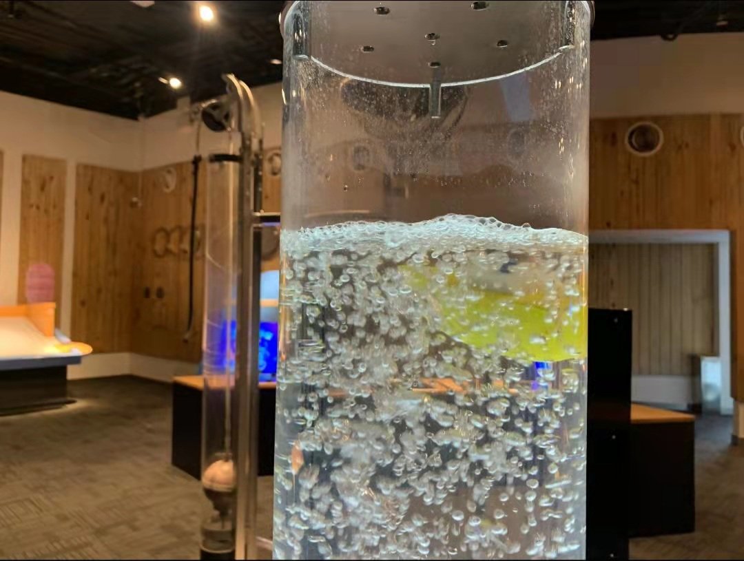 塑膠管底部釋放的氣體像氣泡一樣向水面上升,大量的氣泡降低了水的平均密度,當氣體到達水面時,氣泡令水面的浮力下降,位於此處的船隻會失去水的浮力,像石頭一樣下沉。