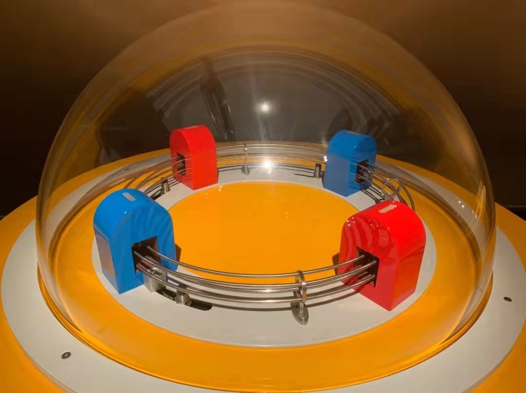 半球形托盤下的裝置會產生一個旋轉磁場。金屬蛋在旋轉磁場中會感應產生渦電流,此電流所產生的力最終驅使金屬蛋與磁場一同旋轉。