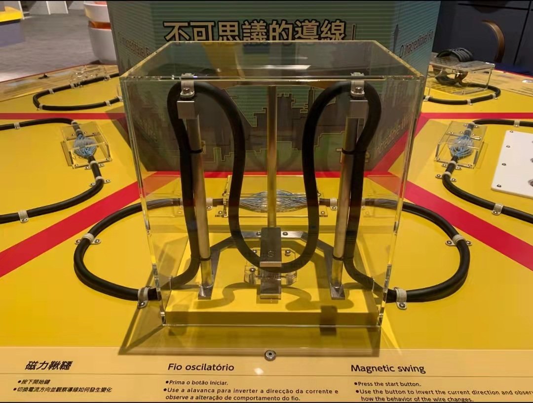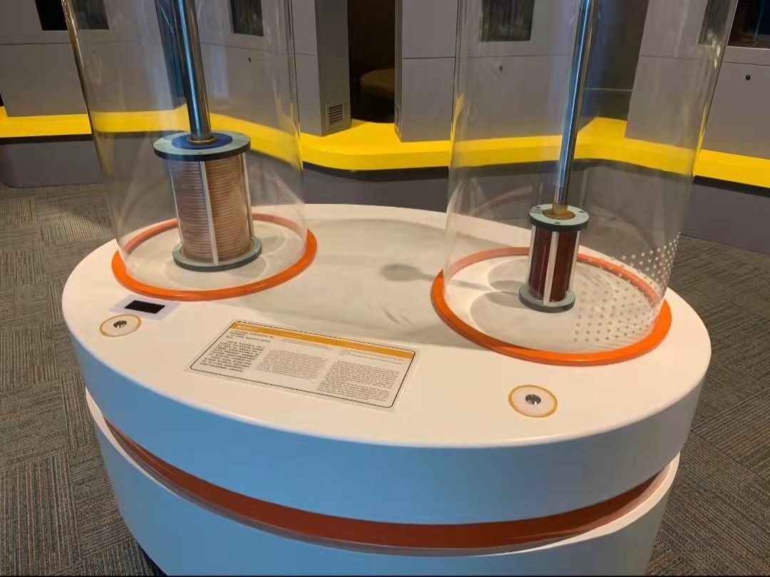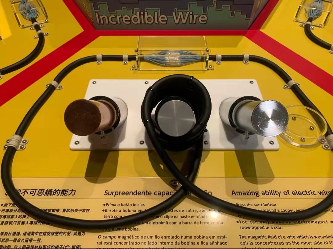 當交流電流過導線後,產生磁場,當導線移至線圈周圍時,線圈會產生感應電流,從而點亮燈炮。當導線離開線圈後,燈泡隨之熄滅。