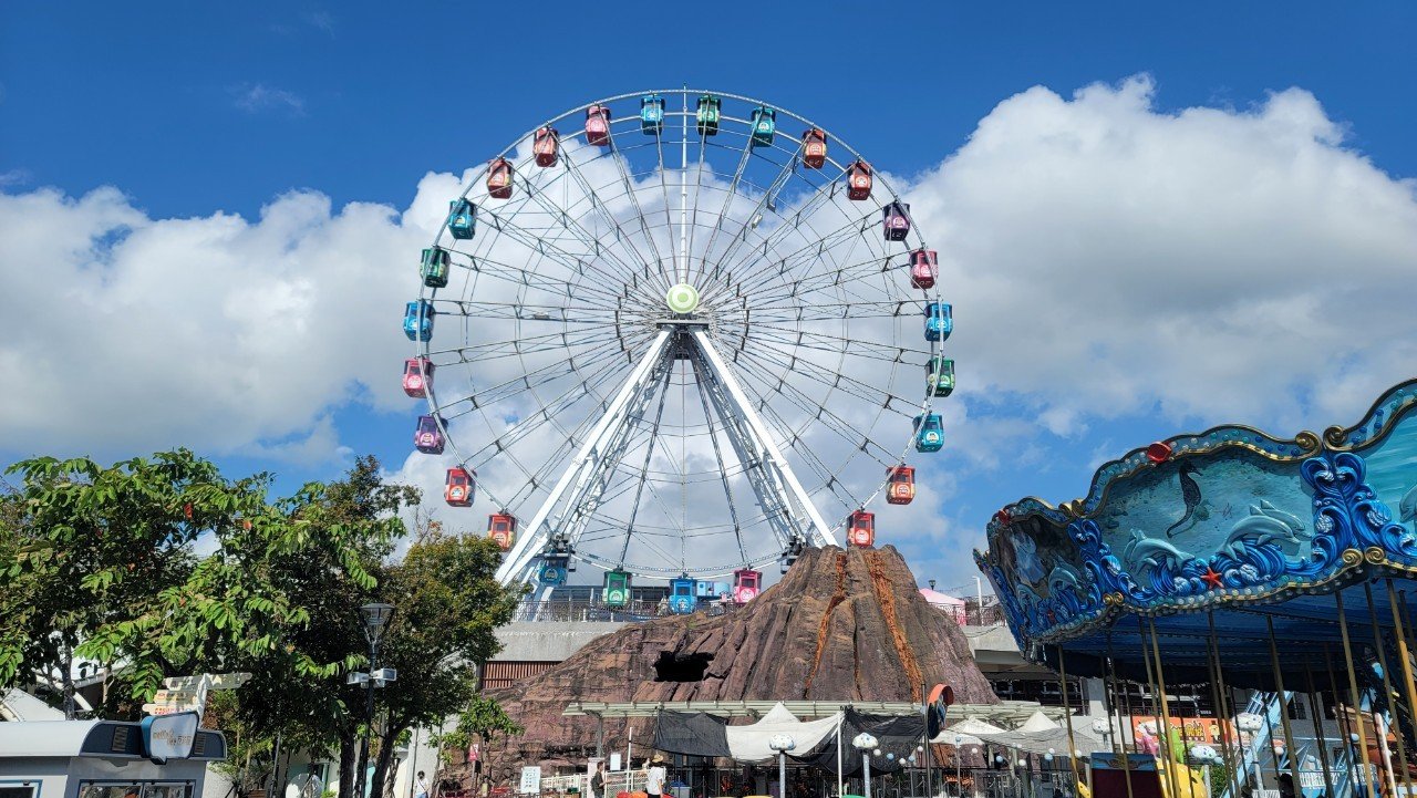 您眼前看到的摩天輪不只是本區地表上最亮眼的樂園地標,更是從高處俯瞰整個樂園的最佳視角。圓輪設施的直徑高達40公尺,共設有27個座艙,輪體和支架外觀為夢幻米白,當中懸掛著五顏六色的方體座艙。夜間運轉時,輪軸支幹外裝滿多彩繽紛的圓型燈泡,會根據節奏不時閃爍發亮。每個座艙上方都設置太陽能板,供應座艙內部的照明。依循著工作人員的引導走進設有涼爽空調的座艙裡,兩側設有舒適的黑色軟墊座椅,四周圍皆是能遮陽的灰色透明窗,方便遊客在搭乘中能不畏強光且舒適地欣賞美景。