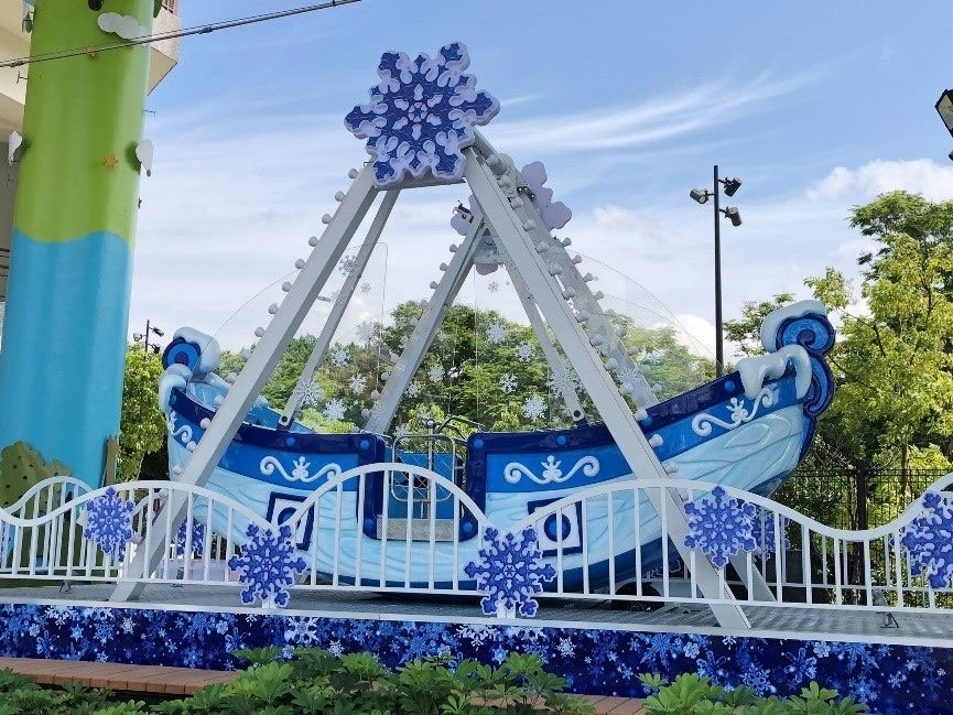 「冰雪奇航」是適合小小朋友們乘坐的迷你版海盜船,夢幻冰藍色的船身印著一片片可愛的大雪花,上方還有著透明雪花片玻璃罩,仿彿乘坐在船上前往極地探險,搏擊於驚濤駭浪之間。運轉時船身會來回擺盪,交替而至的失重和超重感覺,帶給兒童驚險刺激的體感冒險。