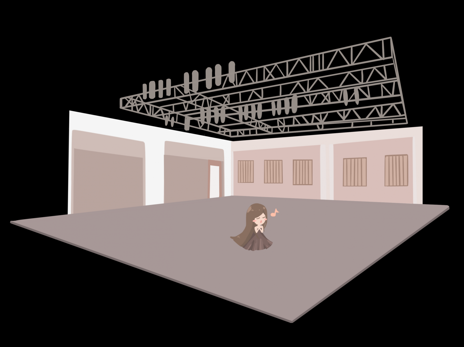 另外,舞台上方空間設置有桁架懸吊系統提供懸吊布景燈光,以及供技術工作使用的七道貓道。