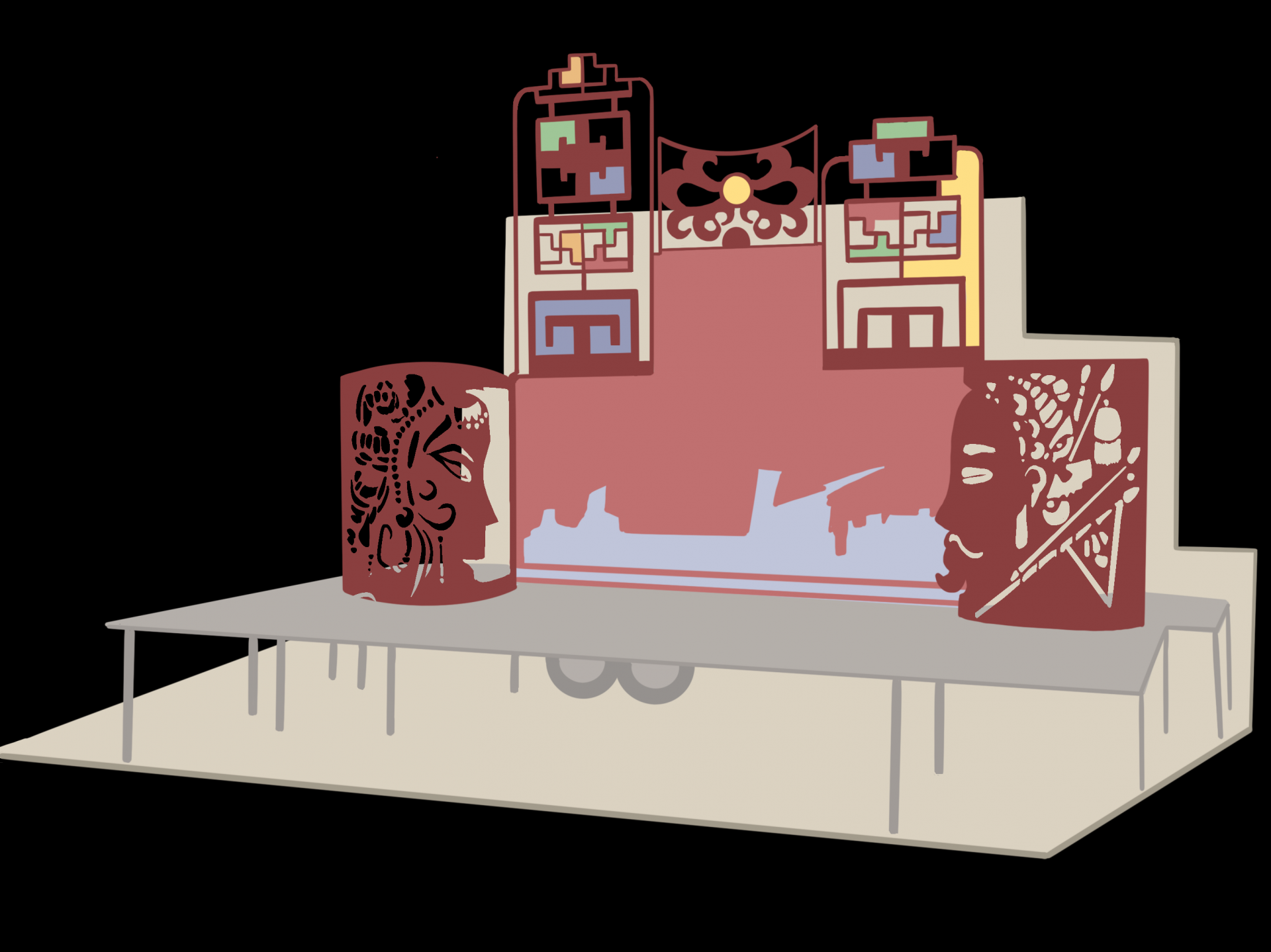 為了讓觀眾重溫過去看野台戲的體驗,戲曲中心開發一台宛如變形金剛的行動藝術車。以一桌二椅為主體,極富特色的傳統剪紙作為設計主軸,配上傳統戲曲服裝鮮豔的色彩,矗立在廣場上,隨著自然光影的變化,呈現不同的視覺效果。收疊起來的時候是一座裝置藝術,展開來則變身為一座繽紛、充滿童趣的造型舞台。還可迅速地開到任何定點,展開就成了可供表演的行動小舞台。